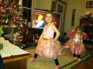 Amazingly, both kids ate all their dinner without me having to beg…odd…maybe we’re looking at a more pleasant dinnertime experience in 2012? Ha. I do like to kid myself…just for kicks. I totally bribed them with soft pretzel and pizza roll snacks ‘for later.’ Then, they played dress up together nicely for, like, an hour…ok… what’s to come? Where’s the meltdown? Daddy comes home on time, and gets welcomed by a tornado full of glitter that constantly streams down off their dress up clothes, and a photo montage of the night’s outfits. Rock Star Bri and Princess Lo continued to run around laughing and screaming…Lo with two chunks of pretzel in here hand and a ‘dink’ sippy under her arm at all times. I have to say…best New Year’s Eve Party ever.