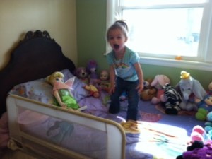 Freshly adorned with Tinkerbell bedding, Lauren climbed up there and had a little ‘big girl bed’ party for herself. Slept through the first night, and never turned back. That first morning the loud thud of her falling out of her big girl bed ensued a sprinting panic, and there she laid on her back looking up at us with an ‘Oops, I forgot I had to climb down’ expression on her face. “I’m al-wight!”