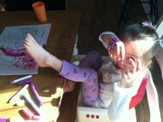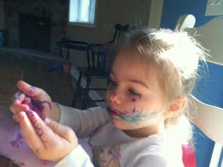 Yes. She “marker-ed” her face. And her fingers and her toes…and my kitchen table. Oh, and a little bit on the coloring book, too. That’s what I get for drying my hair.